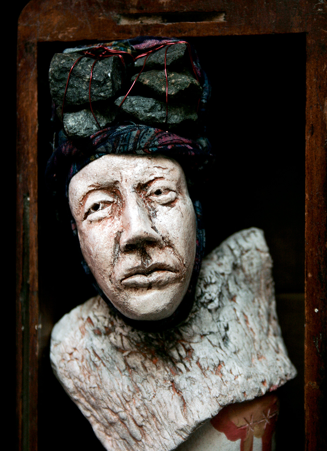 caryatid – detail 2012 December 3, 2012 | veronicacay mixed media assemblage – ceramic, rocks, wire, fabric, vintage sewing machine drawer, stains, underglaze and acrylic