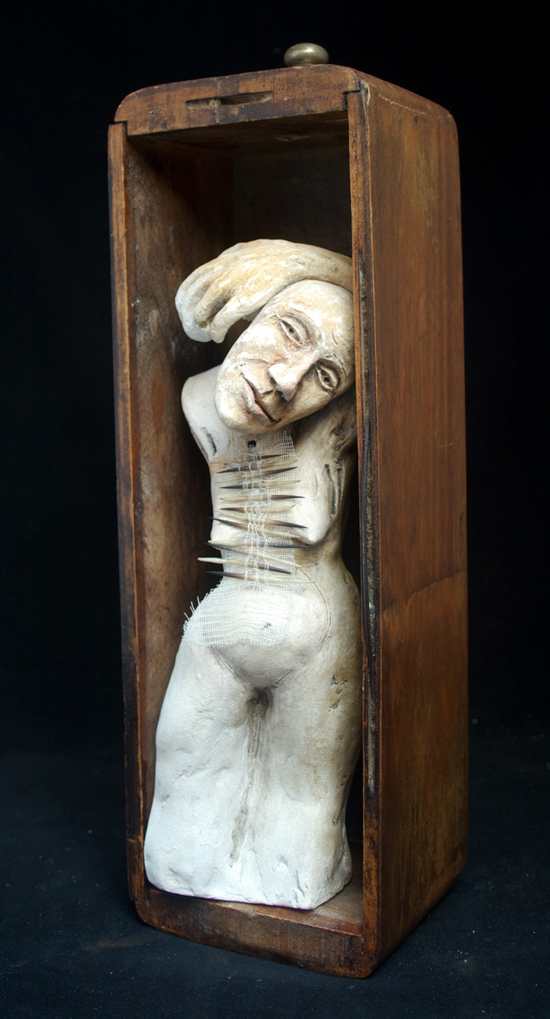 i do remember February 27, 2013 | veronicacay clay sculpture assemblage vintage sewing machine drawer, echidna quills