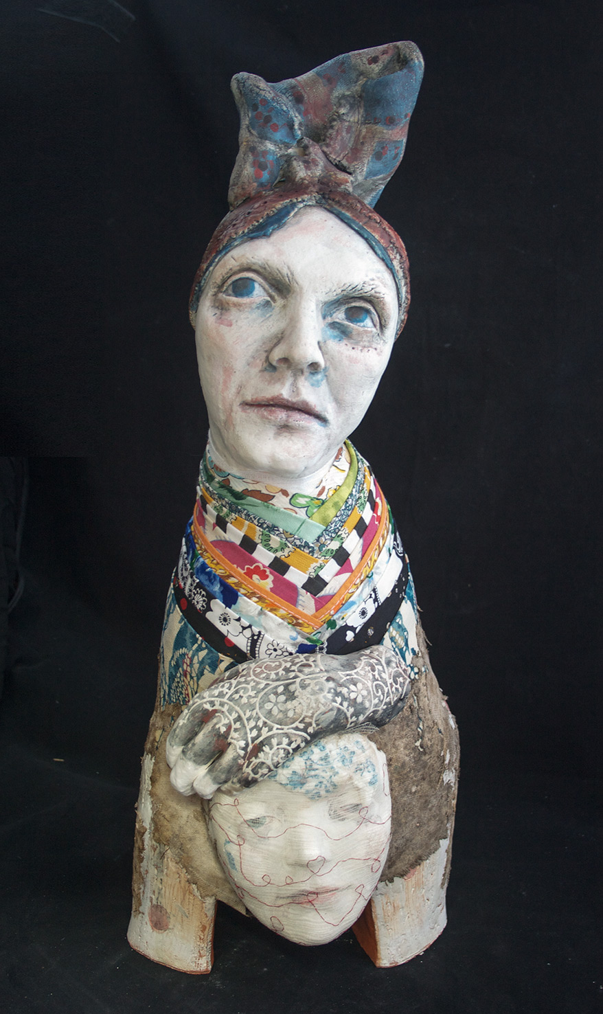 hand built ceramic sculpture, engobe, underglaze, japanese tissue stencils, vintage apron and kimono silks, embridery, decaying canvas 50 x 30 x 20 cm