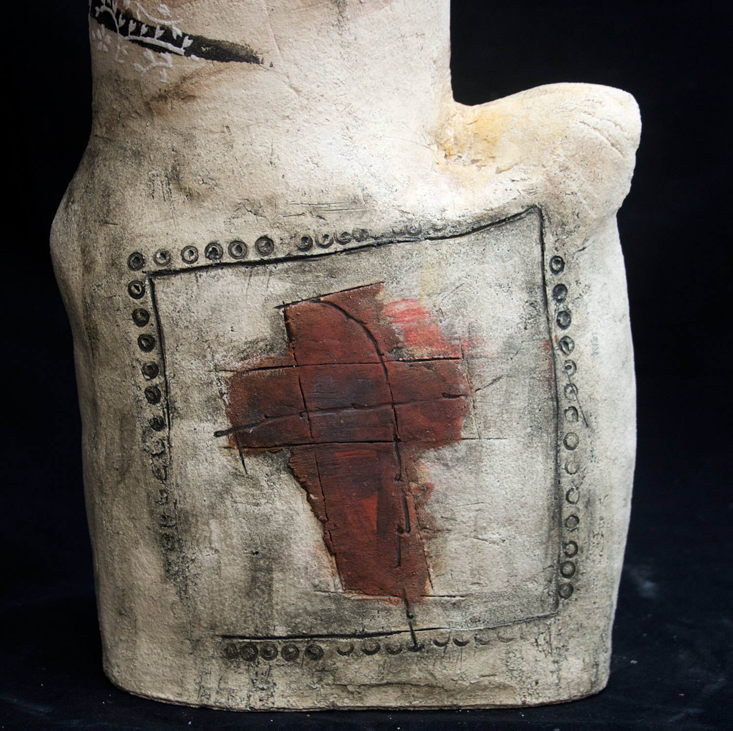 mixed media sculpture, hand built ceramic, underglaze print and and hand painted , terracotta inlay, stains, engobe, vintage bible pages, vintage fabrics and threads, vintage fishing lure. size 53 cm x 25cm  x 25cm