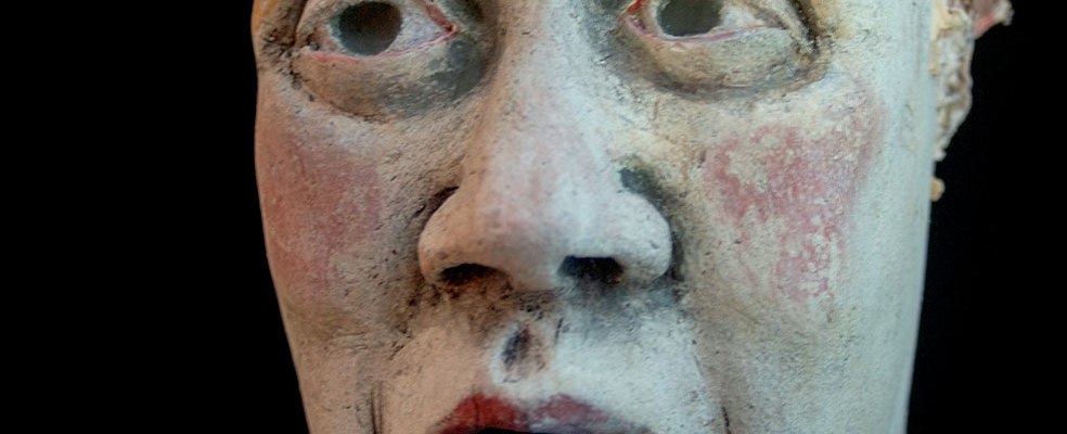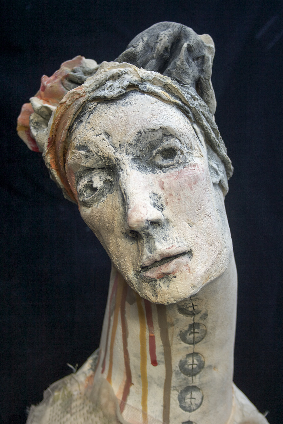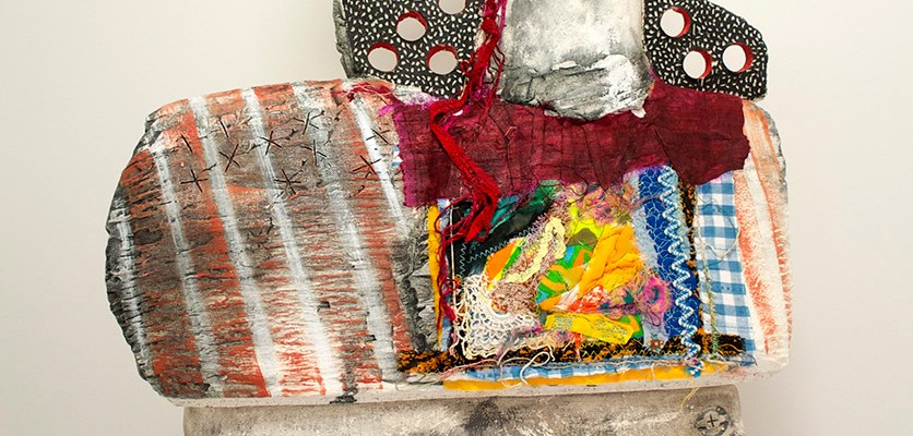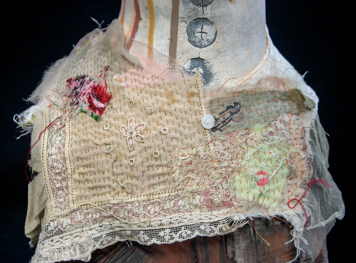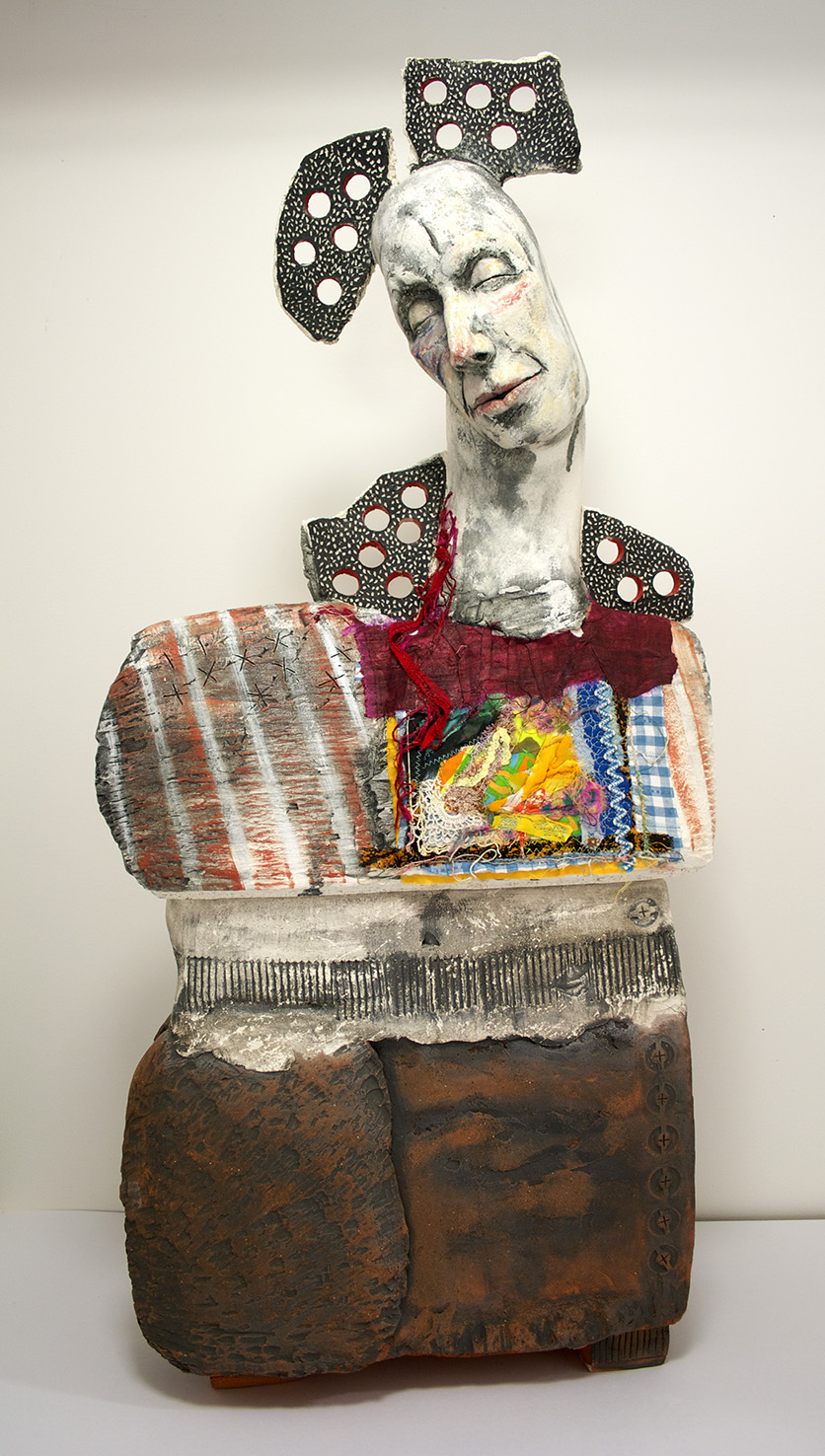 hand built ceramic sculpture, engobe, underglaze, japanese tissue stencils, vintage apron and kimono silks, embridery, decaying canvas 50 x 30 x 20 cm