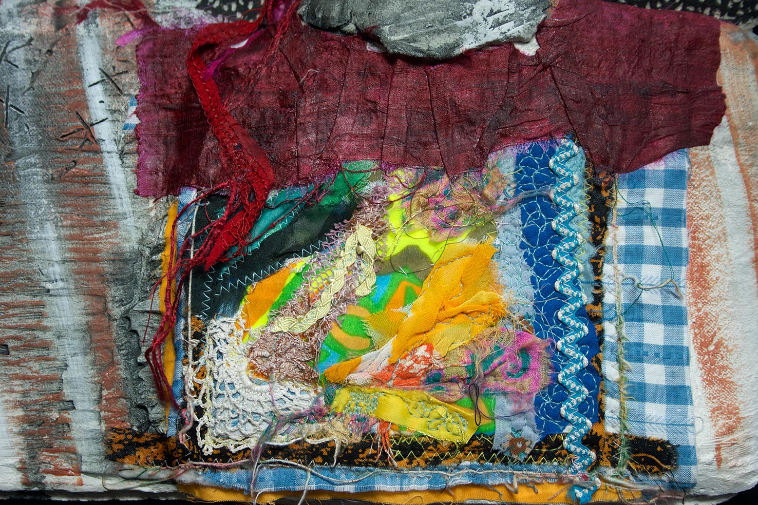 One siren finished – detail of her bodice which is machine and hand embroidery, vintage fabrics and threads.