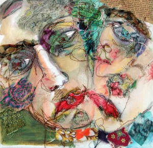 of gauze field bandage with cigarette cards sandwiched between the layers and stitched. The sculpture sits in front of the panels.